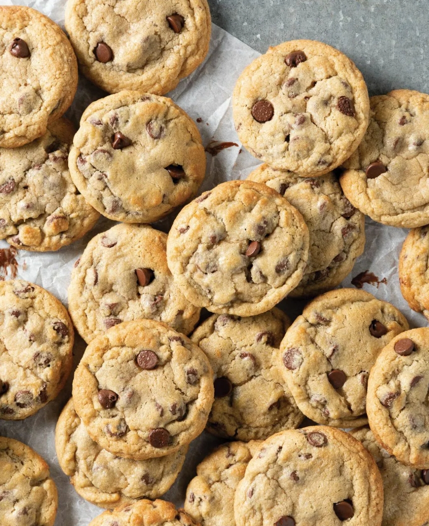 A set of twelve soft-baked cookies. Each cookie contains chocolate pieces that melt slightly when warmed.