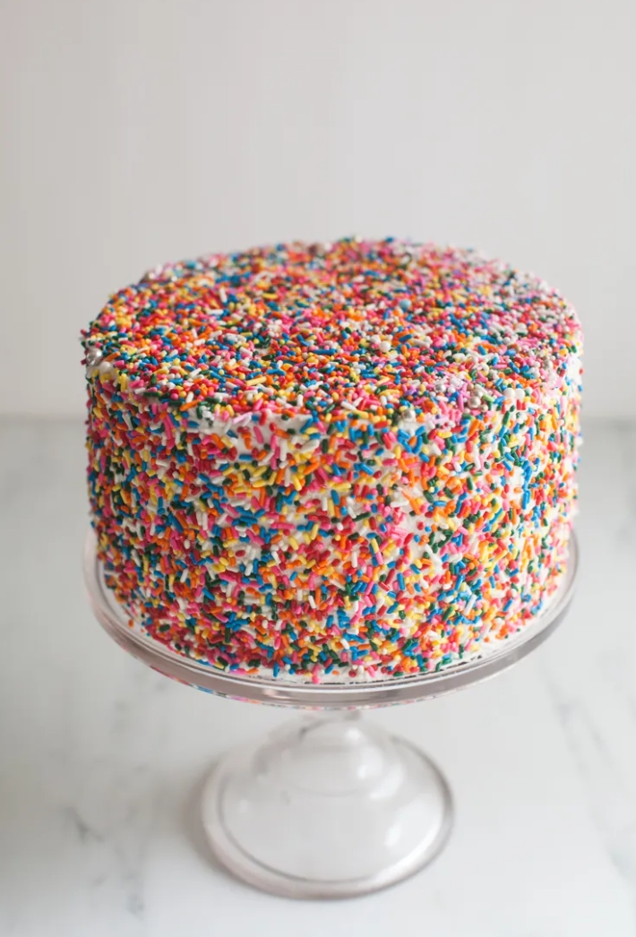 A single-layer 8-inch cake with vanilla buttercream. The batter includes colorful sprinkles throughout.