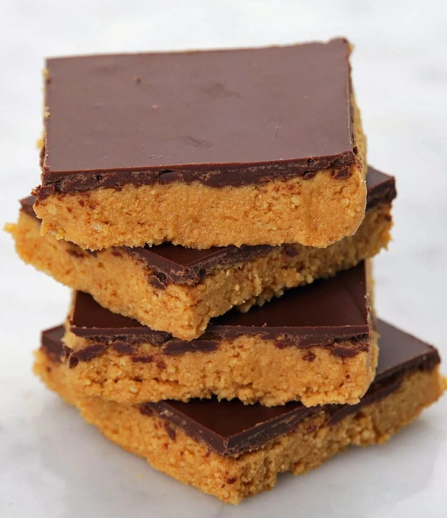 A set of eight bars with a peanut butter base and chocolate topping. The bottom layer is crumbly and slightly salty.